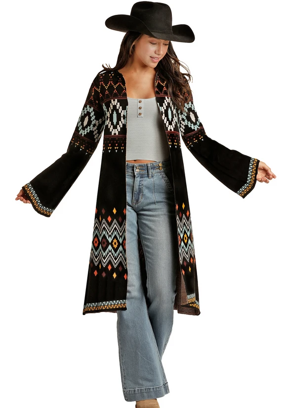 Powder River Outfitters Ladies Jacquard Aztec Long Cardigan Black L