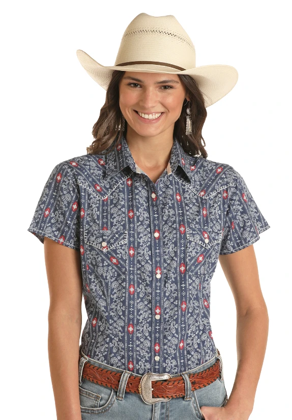 Rock & Roll Denim Ladies Paisley Wallpaper Stripe SS Snap