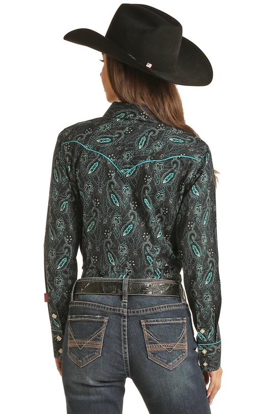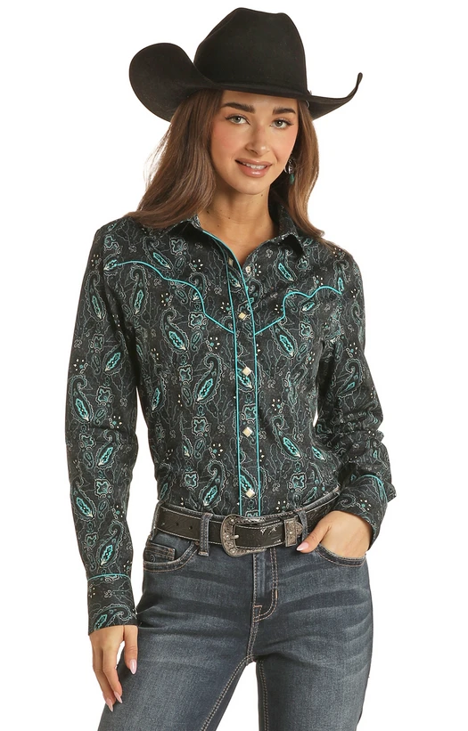 Rock & Roll Denim Womens LS Paisley Snap W/piping Teal